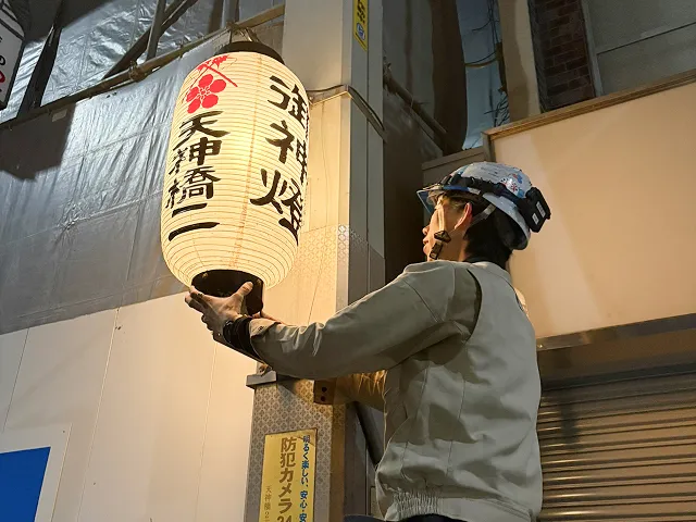 年末年始や天神祭りの際には、天神橋筋商店街のちょうちんの取付・撤去を行い、にぎわいある街の景観づくりをお手伝いしています。